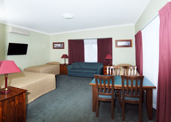 Deluxe Family Room - from $175 per nightFamily fun trip for 4 or 5.... Bedding configuration is a queen bed, two singles beds and a double sofa bed all in the one room. Extra features: Shower over bath, kitchenette, lounge, large flat screen TV, a split system air conditioners/heater and FREE wifi. Rates are for upto 4 people. Extra adults $15. Extra children $15. The room caters for a maximum of 6 guests. |